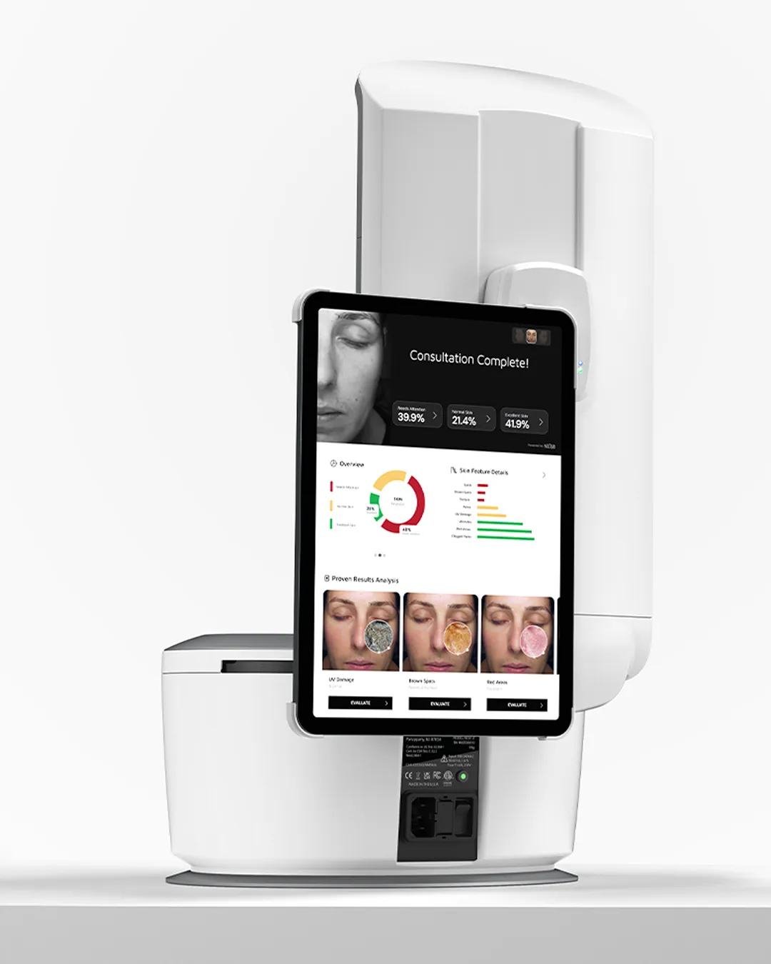 Die NEXA LT Hautanalyse ist ein mobiles, KI-gestütztes System von Canfield, das iPad-Technologie für präzise Hautanalysen nutzt. Es bewertet Hautmerkmale wie Falten, Poren, Pigmentflecken, Rötungen und UV-Schäden, um maßgeschneiderte Behandlungen zu ermöglichen. Das System ist kompakt, mobil und liefert hochauflösende Bilder zur Visualisierung des Hautzustands.